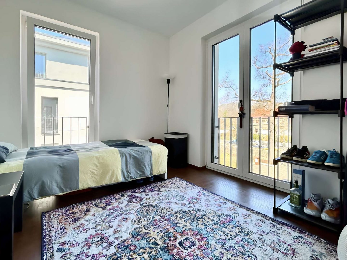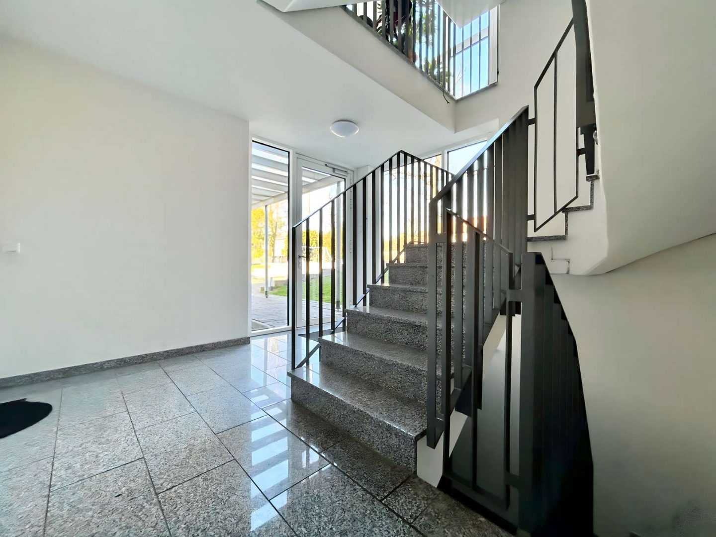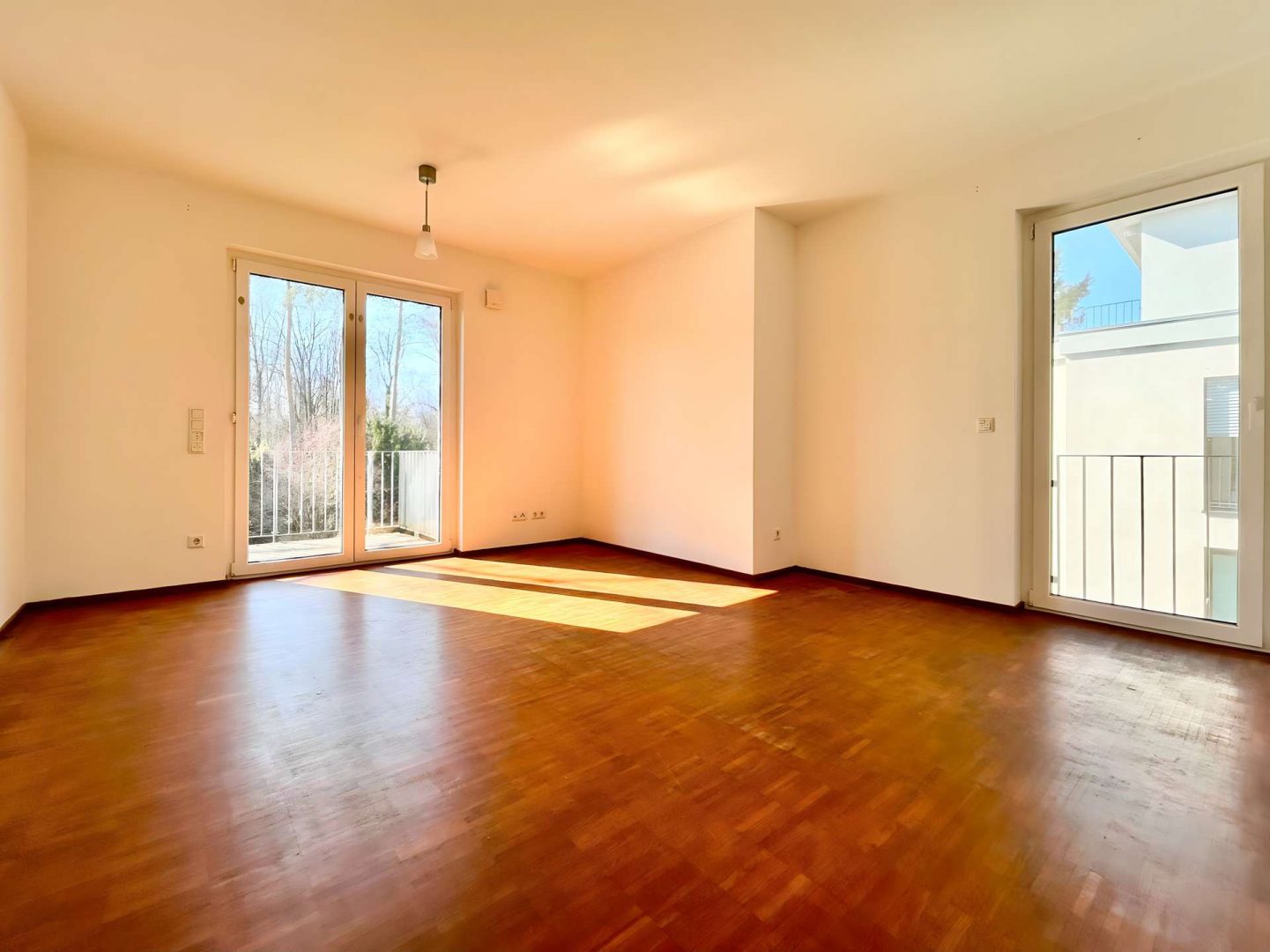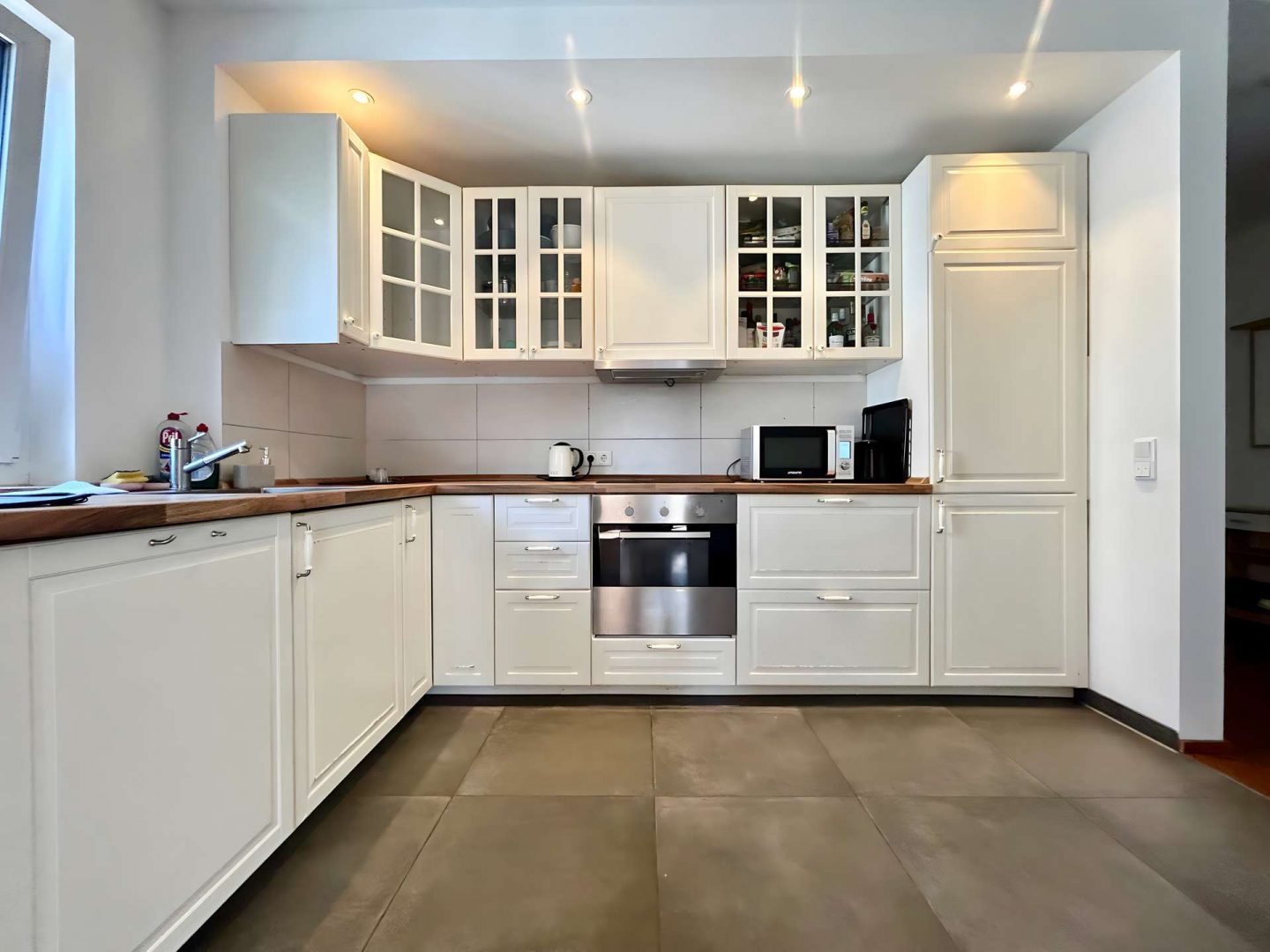Die hochwertige Einbauküche ist mit modernsten Geräten ausgestattet und wird ergänzt durch ein stilvolles Badezimmer mit Badewanne und separater Duschbad – perfekt für Paare oder Gäste. Edler Eiche-Parkettboden und großformatige Fliesen harmonieren mit der dezenten Fußbodenheizung und schaffen behaglichen Wohnkomfort, während elektrisch betriebene Rollläden und eine Alarmanlage für zusätzliche Sicherheit sorgen.